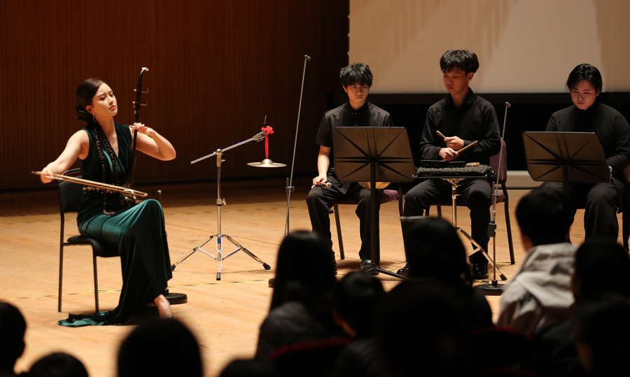 下半场开场,陆轶文与黄蔚傑移植整理的民族弓弦乐版《长城随想》是该版本的首次亮相。在指挥家钱骏平执棒的“弦之韵”弓弦乐团伴奏下,陆轶文以二胡独奏贯穿“关山行”“烽火操”“忠魂祭”“遥望篇”四个乐章,乐曲吸收戏曲、曲艺、古琴等音乐特点,既展现长城的雄伟壮阔,也传递出中华儿女的家国情怀,终曲赢得全场热烈掌声。