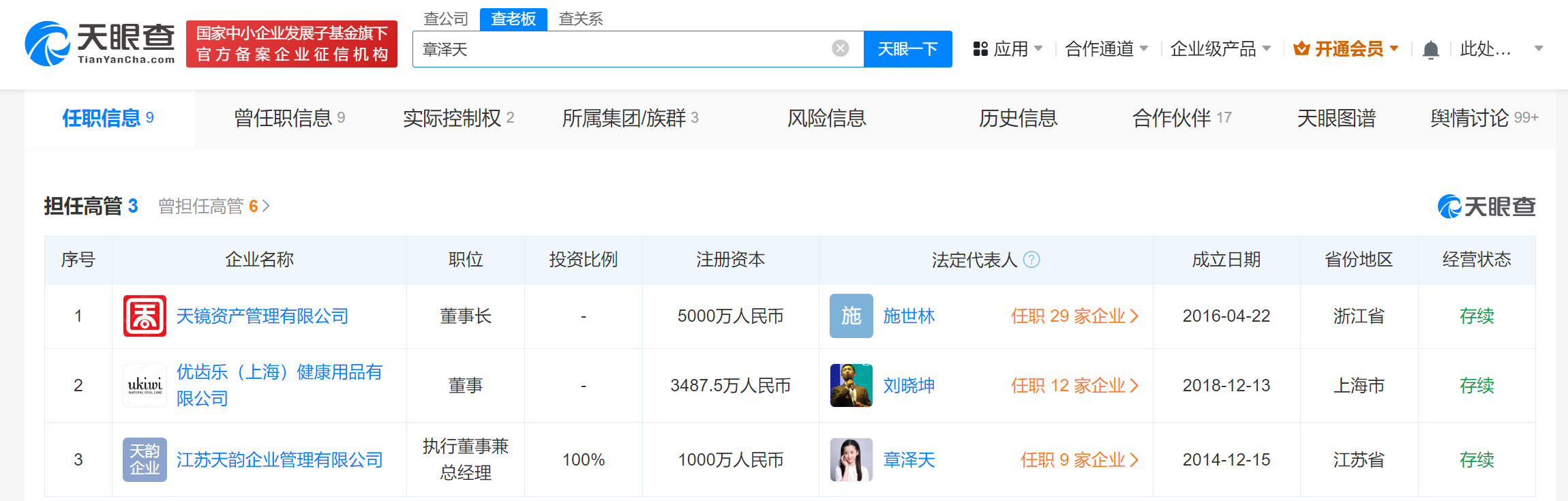 天眼查App显示,章泽天关联的9家企业中8家为存续状态,包括江苏天韵企业管理有限公司、天镜资产管理有限公司等。其中,章泽天持有宿迁天强股权投资合伙企业(有限合伙)、宿迁天际企业管理合伙企业(有限合伙)等6家企业股份,并在天镜资产管理有限公司、江苏天韵企业管理有限公司等3家企业担任高管职务,其版图涉及企业管理、股权投资、基金管理等领域。值得一提的是,海南三亚天博产业私募基金管理有限公司、北京天强坤泰投资管理有限公司、宿迁天强股权投资合伙企业(有限合伙)3家企业为章泽天与刘强东共同持股。