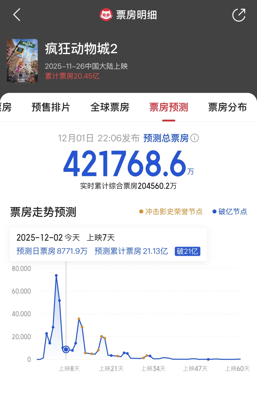 影片进入中国影史动画电影票房前三名,仅次于《哪吒之魔童闹海》《哪吒之魔童降世》。猫眼专业版对《疯狂动物城2》中国内地总票房的预测已上调到42.17亿元,直接瞄准了《复仇者联盟4:终局之战》在2019年创造的42.50亿元的中国影史引进片票房纪录。
