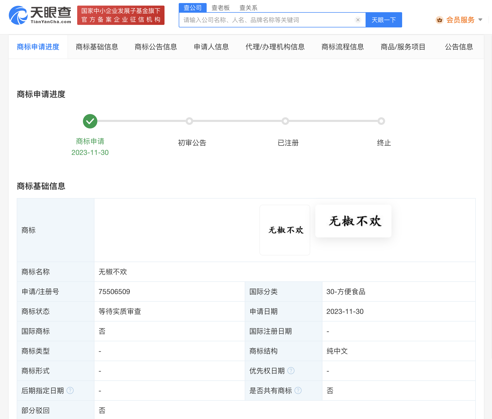 天眼查App显示丹东玻璃棉毡厂家,近日,一米八食品科技(浙江)有限公司申请注册一枚“无椒不欢”商标,国际分类为方便食品,当前商标状态为等待实质审查。