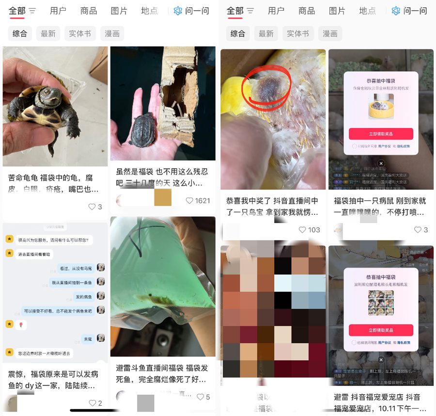 记者多方走访后发现,不少宠物直播间以活体福袋为噱头引人观看,但在这个圈子,“福袋”比正常购买的宠物品相差,似乎是一个公开的秘密。不止仓鼠,养鸟玩家“啾啾妈”也目睹了多次鹦鹉福袋问题事件,“福袋鸟都不是特别健康”。她在观看直播中发现,这些兜售鹦鹉的直播间一般会给消费者挑选的机会,相对活泼的鸟比较容易被挑中,而那些状态一般的鸟就存在通过“福袋”形式“赠送”给消费者的可能性。原本状态一般的鸟在经过快递运输后,生病乃至死亡的概率大大增加。“福袋其实是商家处理‘次品’的方式”,养宠市民刘女士也这样告诉记者。