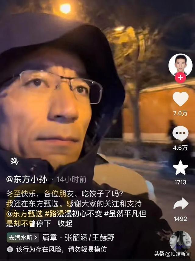 孙东旭最新发声:还在东方甄选在卸任东方甄选 CEO 和非执行董事后,孙东旭22日晚间首度更新视频发声:冬至快乐,各位朋友,吃饺子了吗?我还在东方甄选,感谢大家的关注和支持。