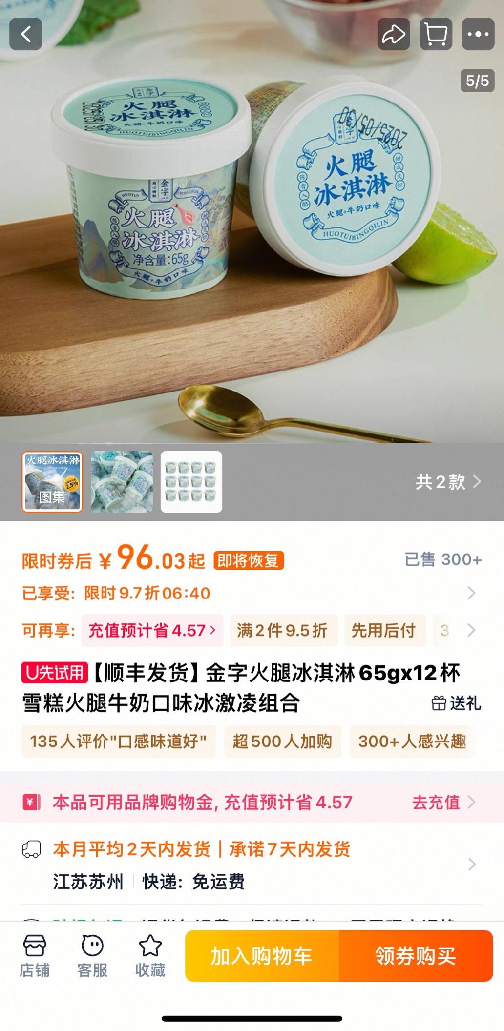 在微博、小红书等社交平台,来自浙江金华金字火腿的火腿冰淇淋也占据了冰淇淋搜索排行榜的前列。在天猫平台搜索可以看到,金字火腿冰淇淋近期有超过500人加购,在冰淇淋领域排在前列。评论区有不少买家评价称超出预期:“冰淇淋口感很细腻,而且里面真的有火腿粒,还以为是黑暗料理,没想到很好吃!”