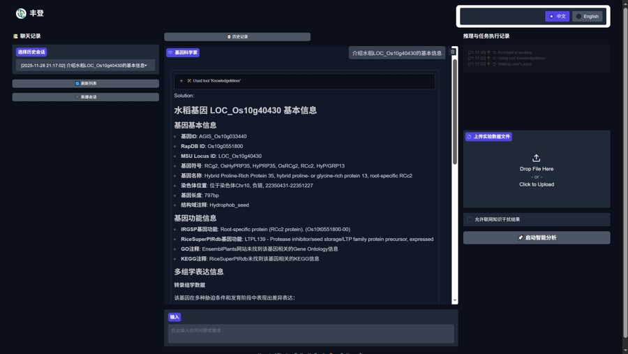 作为一名AI科学家,“丰登”凭借数据整合与逻辑推理的优势,开展高通量基因功能挖掘和系统化科研路径规划。截至目前,已辅助科研人员发现数十个此前未被报道的作物基因功能,关键科研决策均由“丰登”向科研人员提供。