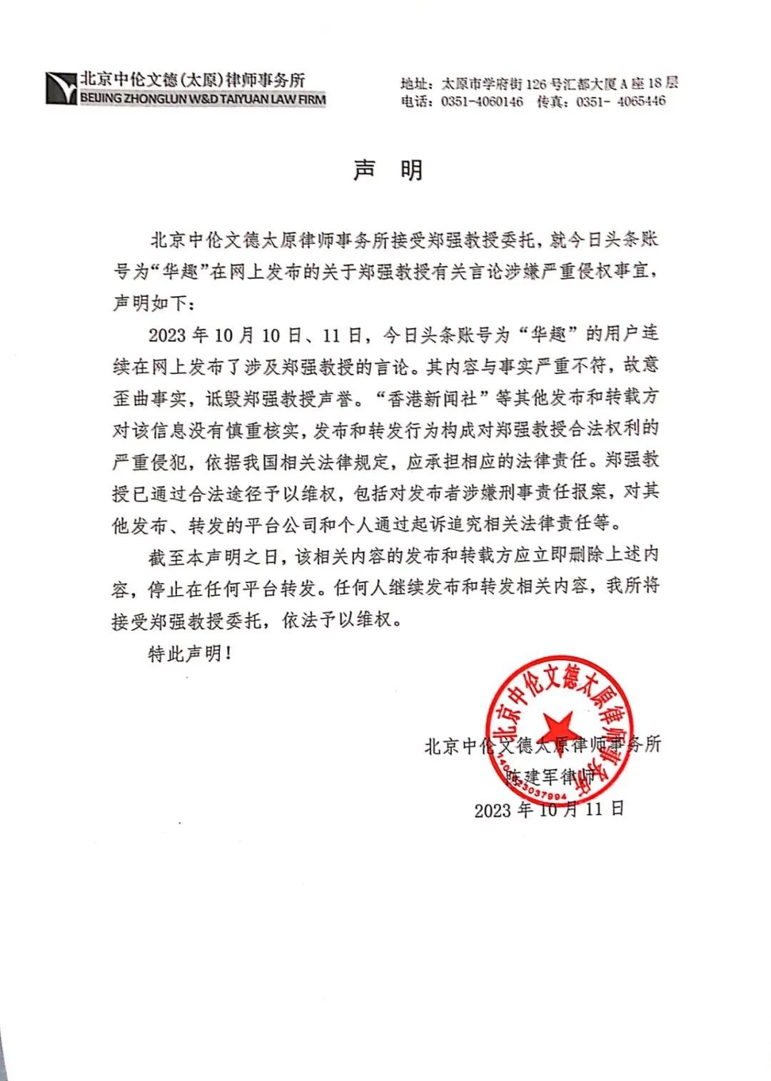10月12日中午,郑强在其个人微信公众号发表严正声明以及律所声明称,“华趣”系刑满释放犯罪人员,其所述内容均为捏造虚构,意图进行敲诈和勒索。