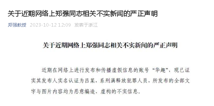 关于近期网络上郑强同志相关不实新闻的严正声明