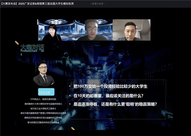 广发证券相关负责人表示:“我们注重培养学生的实战能力和风险意识,希望他们在安全的环境中积累经验,为未来职业发展奠定基础。”高顿教育赛事负责人强调,将持续完善赛事服务体系,助力更多学子实现从理论知识到实践能力的转化。