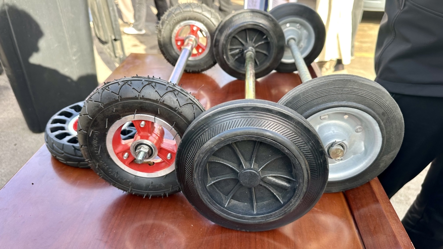 此外,垃圾车举升及倾倒垃圾桶的“哐哐”声也非常刺耳,有些垃圾桶一次倒不干净,反复倾倒,简直是对居民耳朵的折磨。胡振球表示,反复倾倒的问题主要出在干垃圾桶上:“垃圾分类实施前,干湿垃圾混装,一桶垃圾比较重,所以倒得干净。分类后,干垃圾比较轻,倾倒角度不够的话就容易有垃圾残留,需要反复翻桶打桶。”因此,团队将挂桶角度从原来的30°改为40°以上,尽量减少打桶次数。此外,他们还开模测试了4种不同硬度的防撞缓冲胶条,通过空心、开洞的设计,发现2号胶条降噪效果最佳。