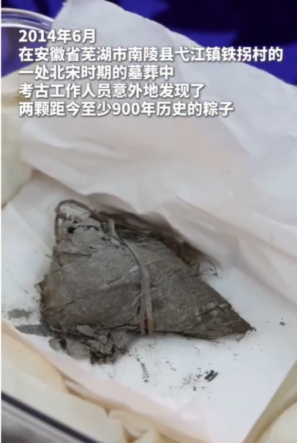 2014年6月,在安徽省芜湖市南陵县弋江镇铁拐村的一处北宋时期的墓葬中,考古工作人员意外地发现了两个距今至少900年的粽子,其中一个粽叶脱落、一个基本完好,它们也是文物考古发现的中国最早的三棱锥状四角粽子。经专家鉴定,粽子里包含有明显的蛋白质产物,应该是肉粽。目前,两个文物粽子正收藏于南陵县博物馆。