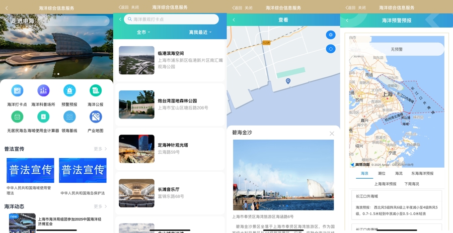 相应地,“走进申海”精心设计了相关内容。在服务市民朋友方面,“走进申海”为市民精心挑选的16个亲海打卡点,遍布浦东、宝山、金山、奉贤、崇明等地,其中既有崇明东滩、临港滨海空间、金山鹦鹉洲湿地等景色亮丽的亲海空间,也有金山城市沙滩、奉贤碧海金沙等海边游玩场所,还包括多个适合拍照打卡的优选位置;为帮助市民朋友更好了解海洋历史、认知海洋文化、关注海洋生态,“走进申海”还为市民朋友精心推荐了6个海洋科普场所,为方便市民朋友了解海洋预警报信息,在更安全亲海,“走进申海”还开设了海洋预警预报信息栏目,及时提供准确的海洋预警预报信息。