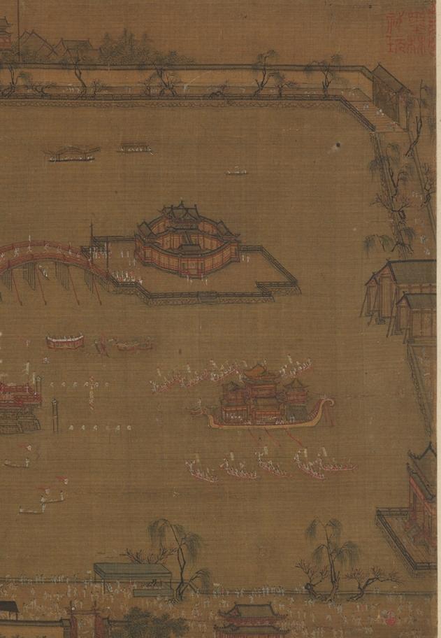 这样的夺标比赛共进行三次。三次夺标赛结束后,所有船只一同鸣鼓,殿后空地响起炮声,全体军士与艺人齐声山呼拜舞:“皇上万岁,万岁,万万岁!”这场盛大的水上表演至此圆满落幕。