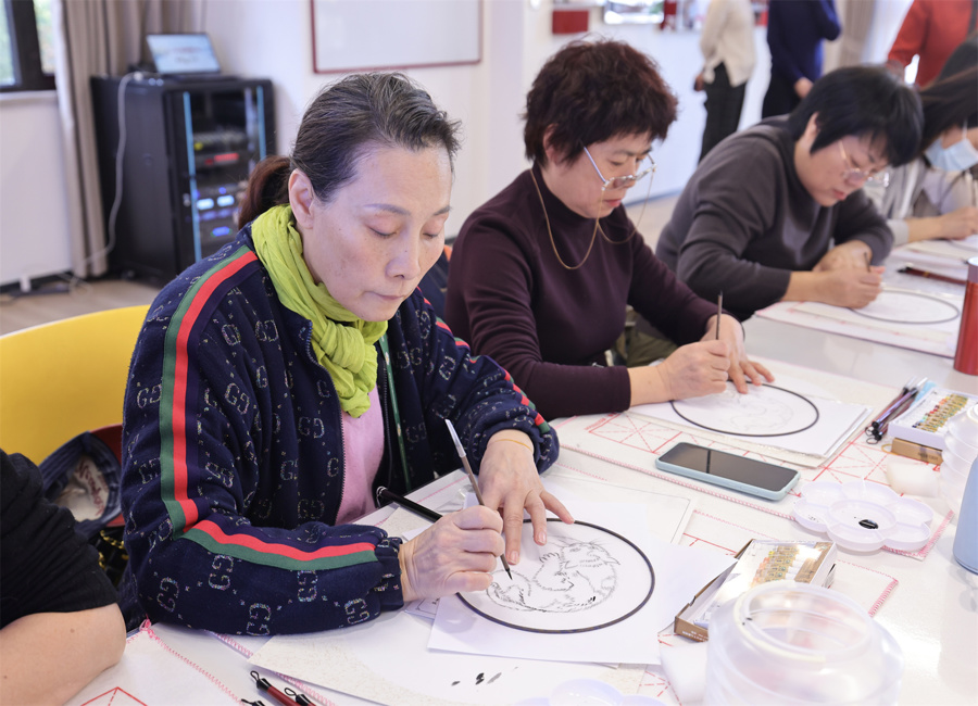 为方便不同年龄层居民观展,上博讲解员用“家常话”为居民解读文物故事,讲到“上海第一稻”时,联系城市周边稻田,聊起上海农业文明的延续;说青龙镇海上贸易,会结合社区外贸小店,类比古代“国际港口”的繁华;谈海派旗袍,还会邀请居民分享家中老旗袍故事。与此同时,作为配套活动,绘画体验工作坊同步开放,街道提供了笔墨和团扇,邀请了网络大V、青年艺术家陈汉煜向30多位社区居民面授国画技法,玻璃棉手把手地教她们怎么把猫咪的鼻子、毛发和肉垫描绘得活灵活现。