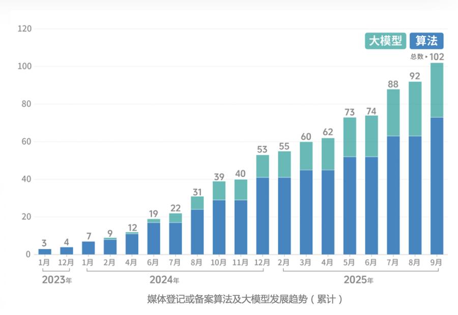 根据《蓝皮书》对中央网信办数据库的统计分析,自2023年以来,全国媒体机构累计登记或备案的AI大模型与算法已达102项。其中,上海表现抢眼,以18项备案位居各省份榜首,占比达17.6%,展现了上海作为科技创新中心在传媒科技应用领域的深厚积淀与活跃生态。