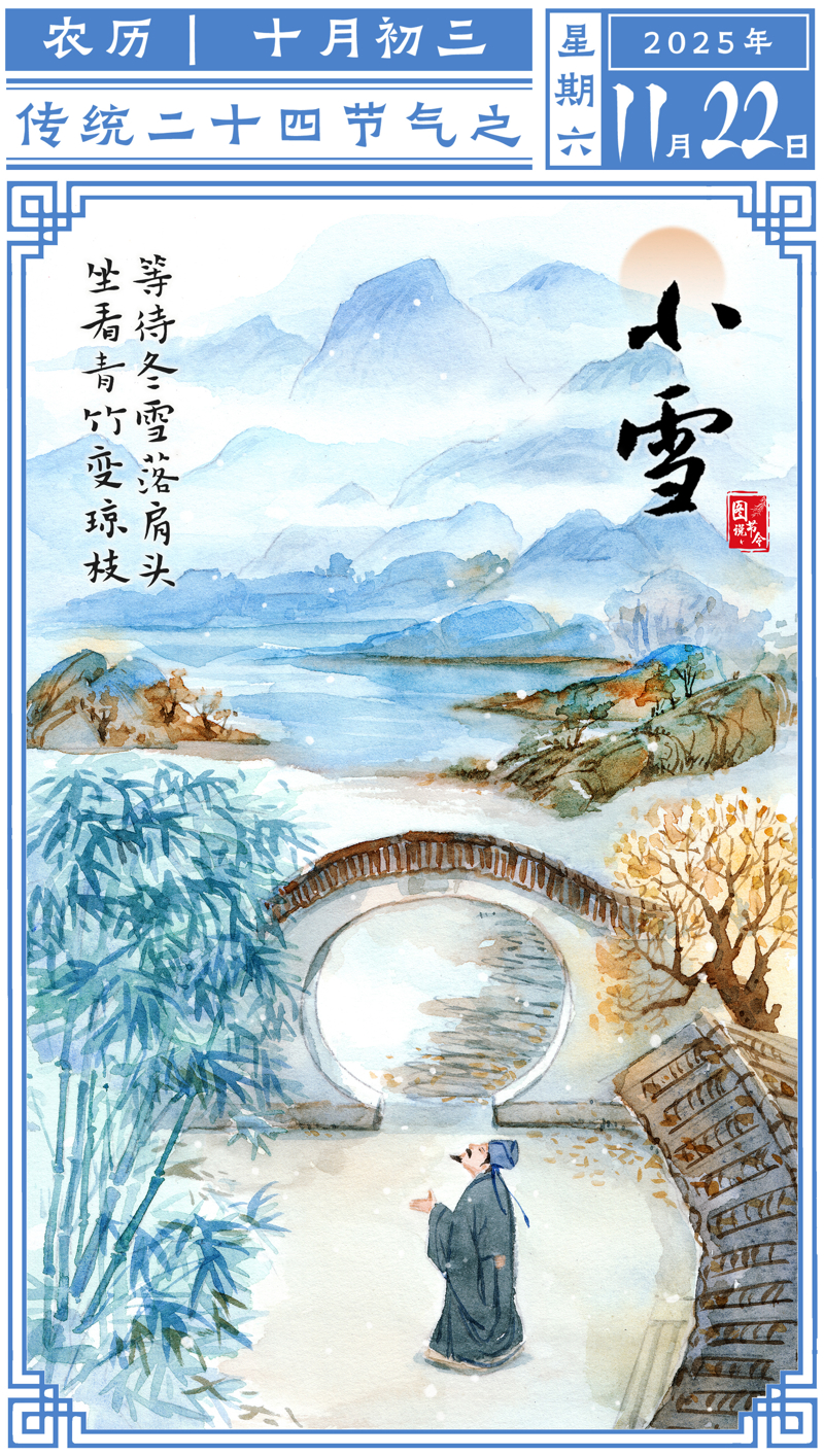 本报讯(记者 马丹)今天迎来二十四节气中的小雪。小雪是二十四节气之第二十个节气,于每年公历11月22日或23日交节。《说文解字》解释此处的“雪”为:“凝雨说物者”。《月令七十二候集解》则认为,“雨下而为寒气所薄,故凝而为雪,小者未盛之辞”。此时,其实雪并不常见,尤其在我国南方地区,秋冬尚且在交棒过程中,更不可能见到落雪。因此,古人给这个节气取名为“小雪”,是对寒气渐盛、降水将凝的一种诗意提醒。
