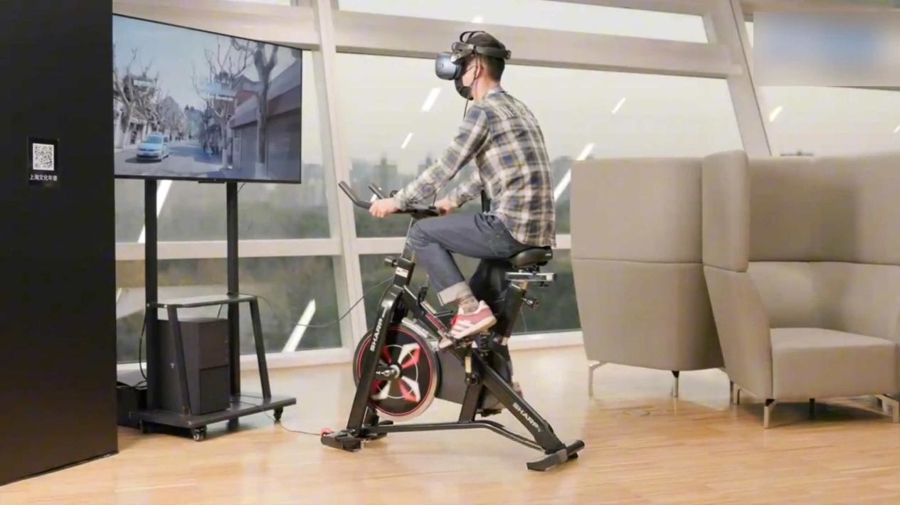 探索并未止步于赛场,十年来,部分团队的创意已成功孵化落地。正在上图东馆举办的“十年求索 智启新程——上海图书馆开放数据十周年展”上,读者就可体验2020年一等奖作品与上图馆藏红色资源融合的“红色VR骑行”项目。利用虚拟现实技术与室内骑行设备,“红色VR骑行”将上海12条红色路线、沿途建筑与历史故事以沉浸式方式呈现,观众在骑行速度的变化中“穿行”于城市的红色记忆,边运动边了解建筑背景,在虚拟空间中完成一场连接数据与文化的体验。