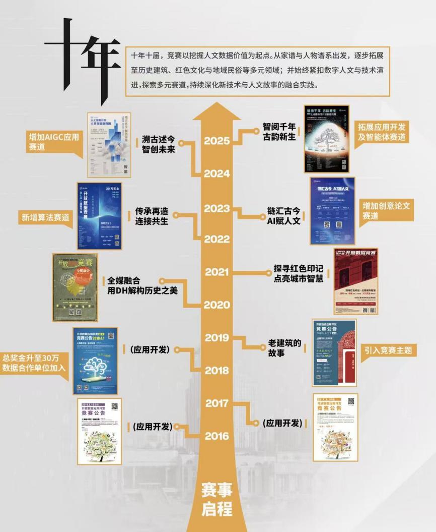 在上海市经济和信息化委员会、上海市文化和旅游局、上海市数据局的指导下,竞赛构建起“开放数据竞赛、宣讲会、专业培训、竞赛展览、竞赛分享会”五位一体的服务推广模式,形成应用开发及智能体、创意论文、AIGC应用三大主赛道,鼓励参赛者基于开放数据开发智能问答、文化游戏、交互式多媒体展示或生成小说、海报、音视频等AIGC作品。十届竞赛累计吸引来自15个国家的1733支团队、4248名参赛者,其中在校生占比约60%,线上线下培训、宣讲与分享活动参与人次超过3万,获奖作品涵盖应用开发、算法模型、论文研究、数字叙事与AIGC创作等多种类型。